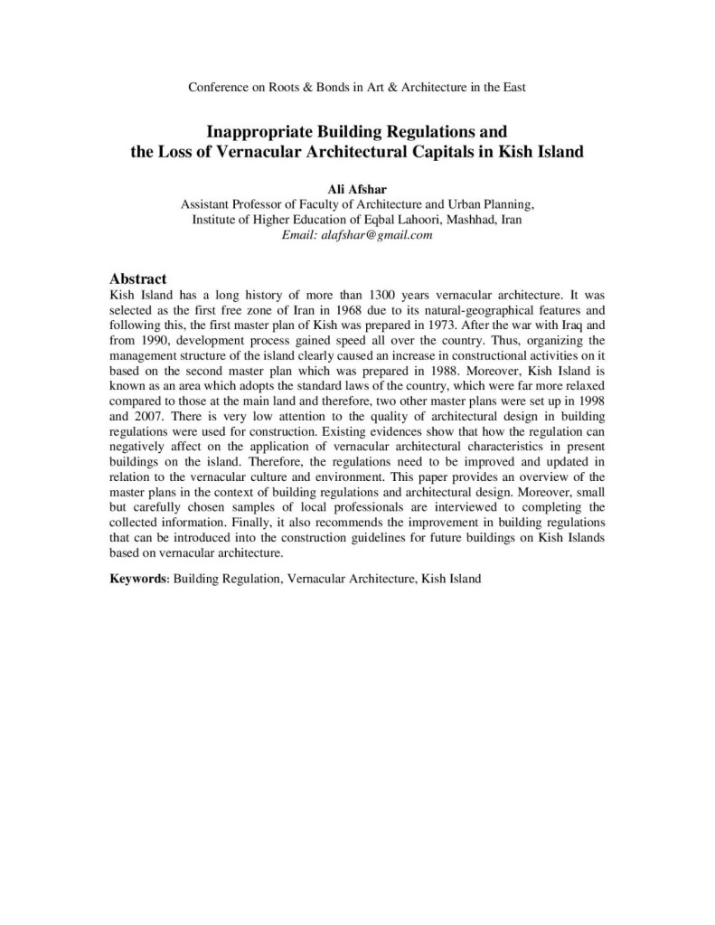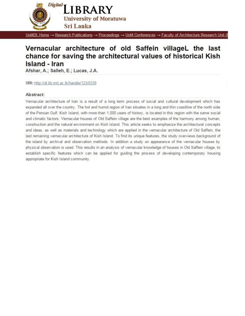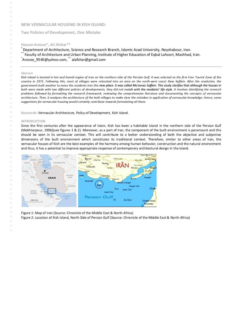 “New Vernacular Housing in Kish Island: Two Strategies, One Mistake”, published in seminar proceeding of 7th International Seminar on Vernacular Settlements, Istanbul, Turkey, 2014.