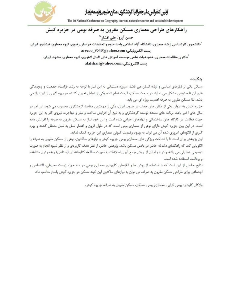 “Vernacular Approach in Low-income Houses in Kish Island”, National Conference of Geography, Tourism and Sustainable Development, Tehran, Iran, 2015. (in Persian)