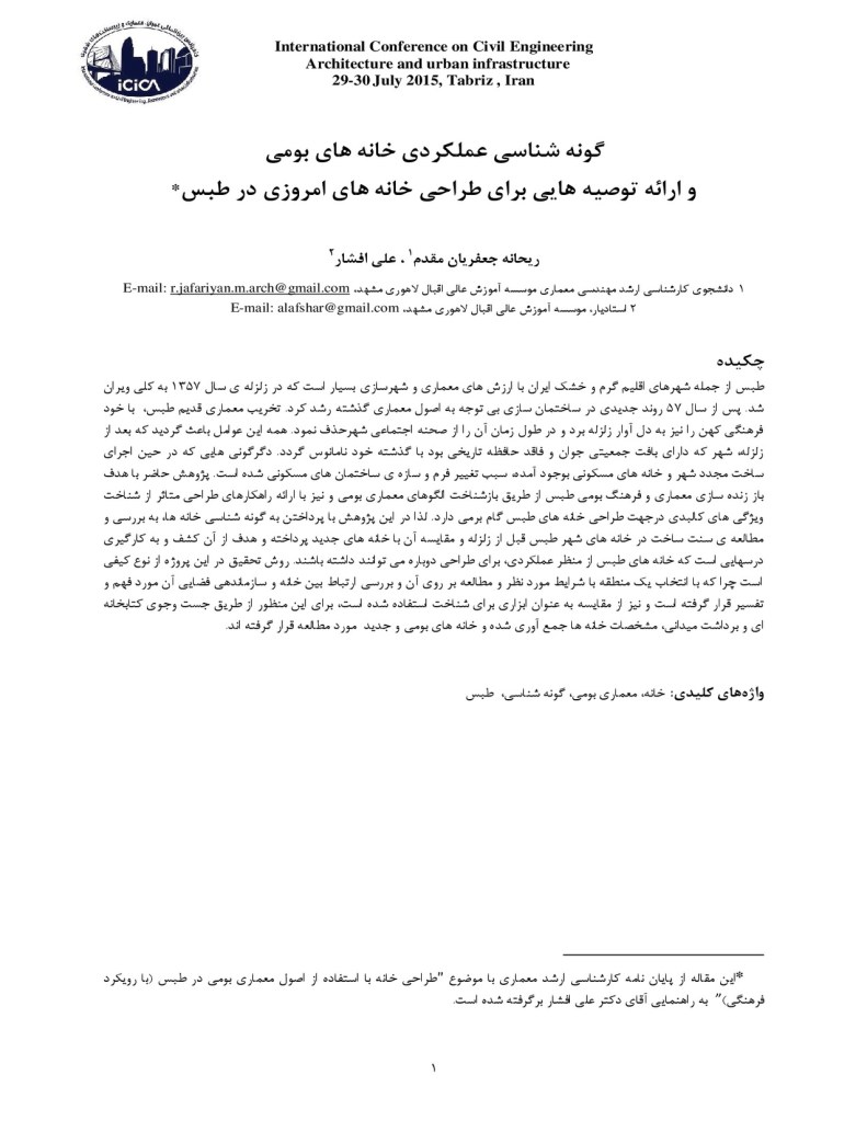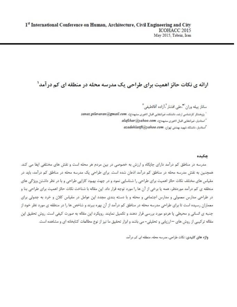 “Important Factors in Architectural Design of a Community School in low-income Districts”, International Conference on Human, Architecture, Civil Engineering and City, Tabriz, Iran, 2015. (in Persian)