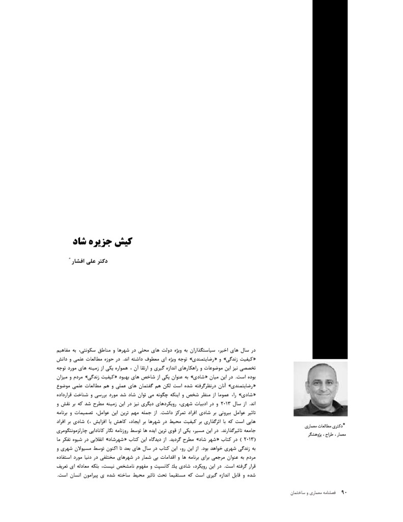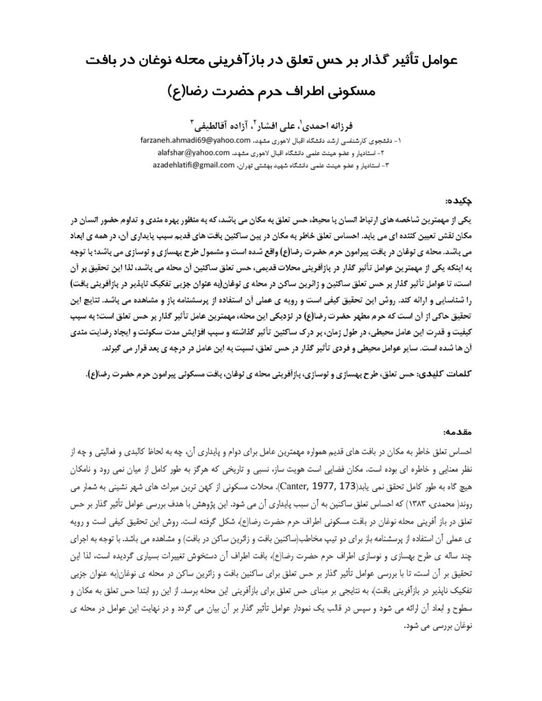 “The Role of Place Attachment in Regeneration Process of Noghan District”, Published in Haft-Shahr: The Journal of Urban Development and Organization, Tehran, Iran, 2017. (in Persian)