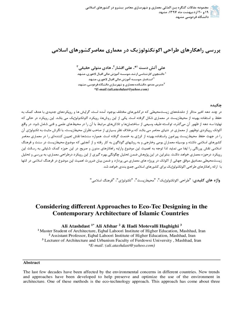 “Considering Different Approached to Eco-Tech Designing in the Contemporary Architecture of Islamic Countries”, Leading International Architecture and Contemporary Urban Planning Congress, Mashhad, Iran, 2019
