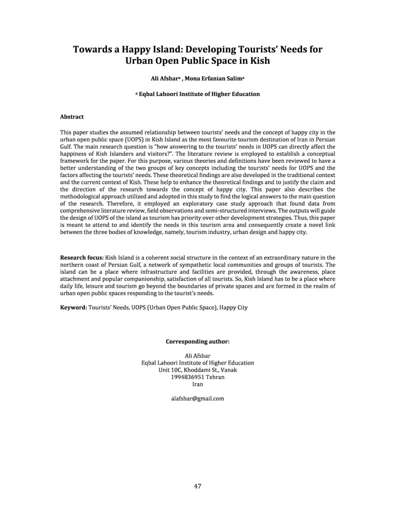 “Tourism Motivation and Tourists’ Needs in Public Open Space (Case Study: Kish Island, Iran)”, accepted for presentation in ITC’14 – International Tourism Congress, Muscat, Sultanate of Oman, 2014. (As an Awarded Paper, Accepted for Publishing in EUROPEAN JOURNAL OF TOURISM, HOSPITALITY AND RECREATION in 2015)