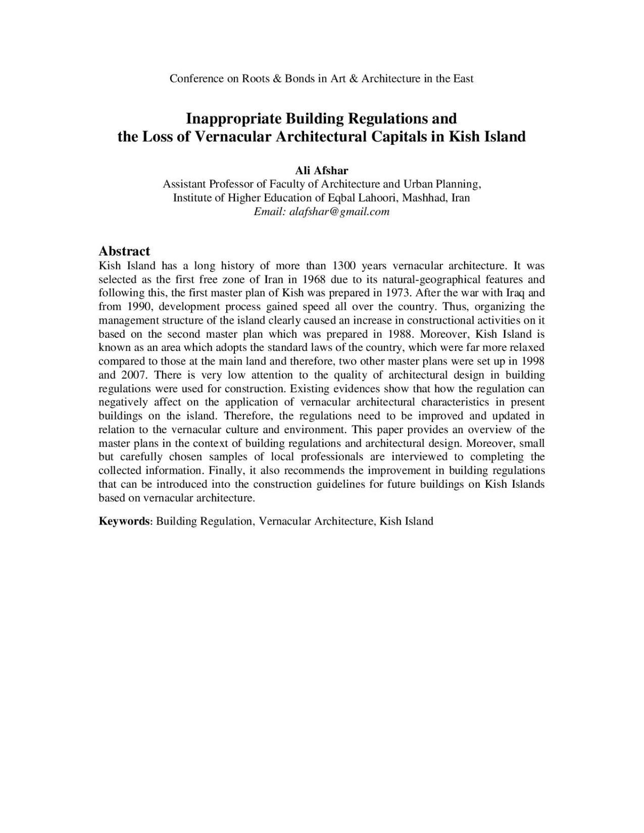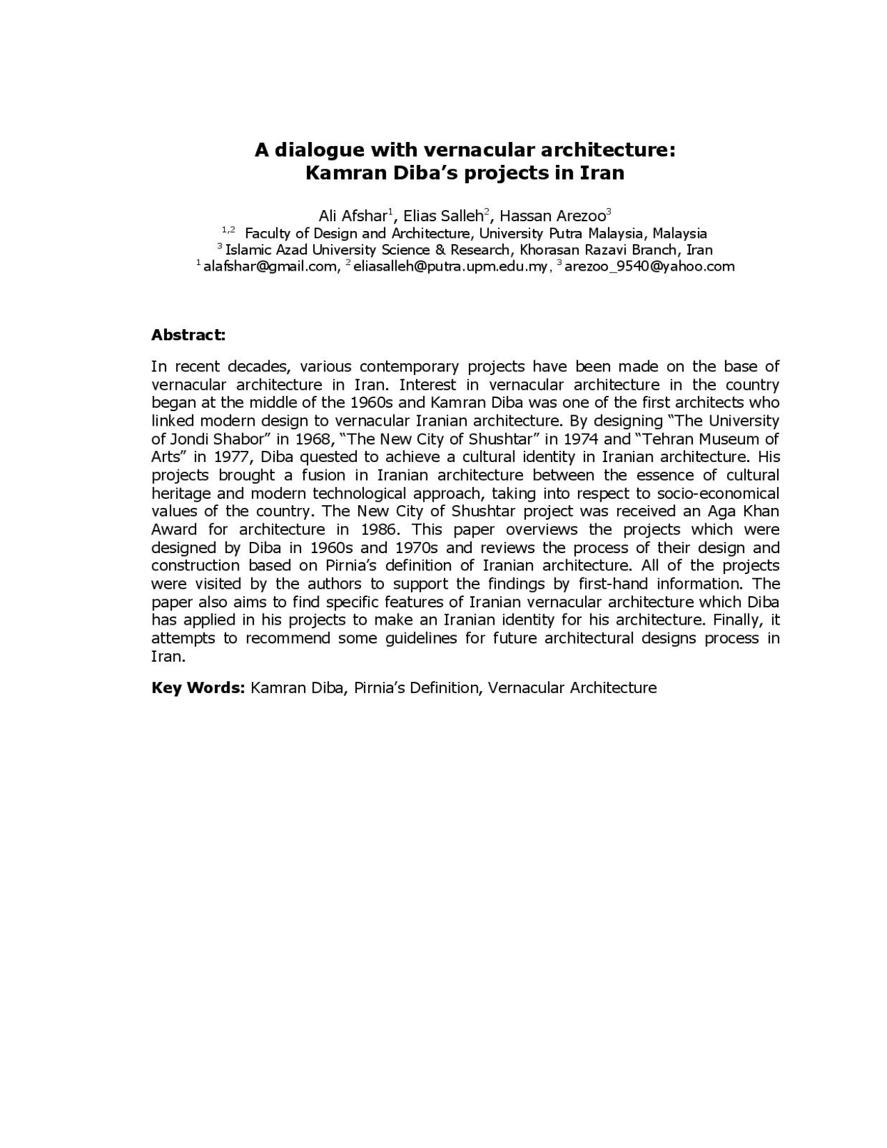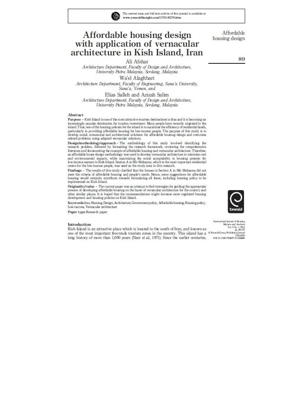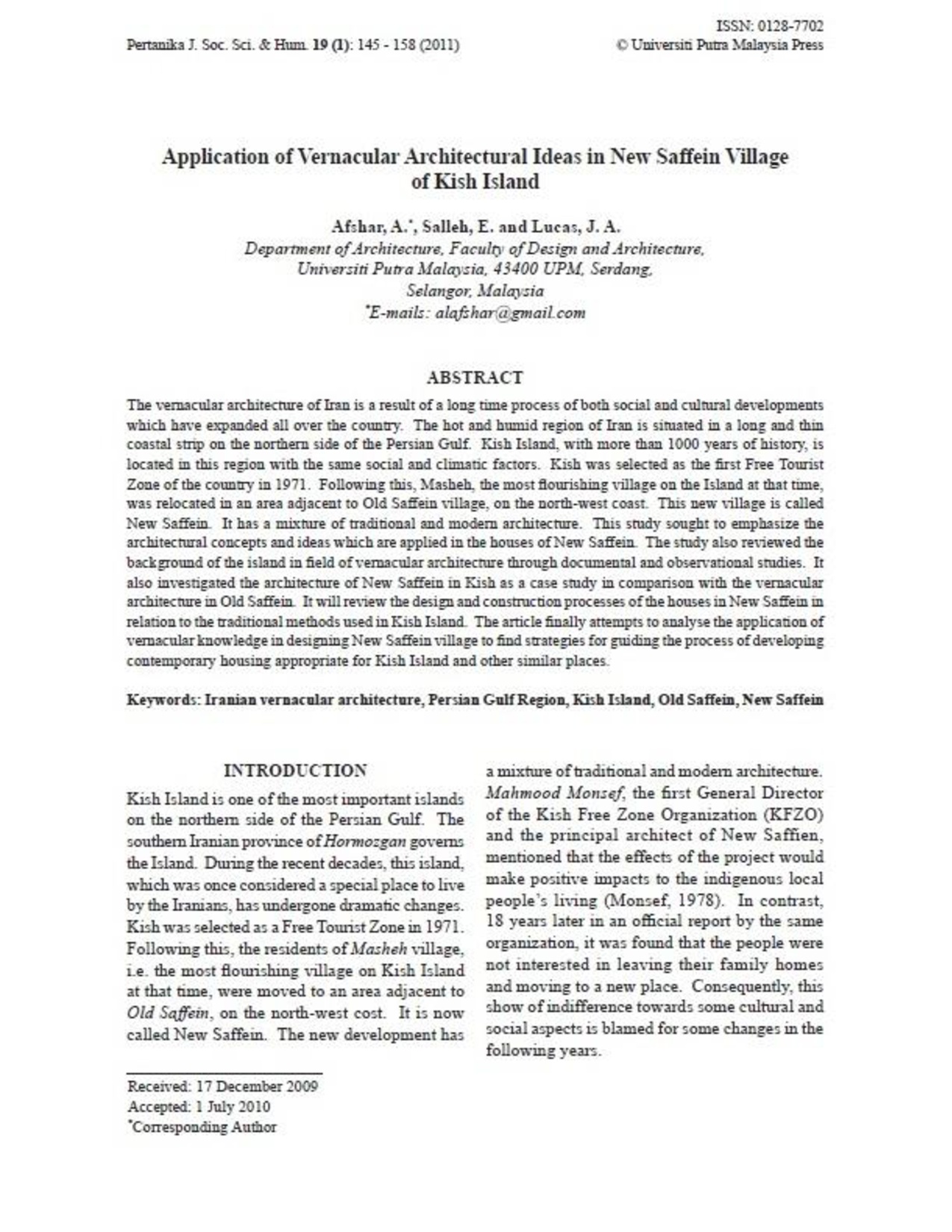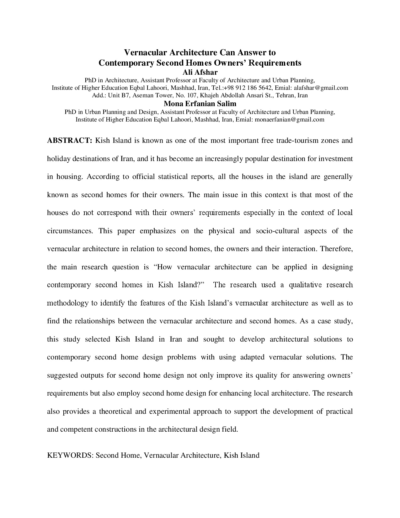 “New Vernacular Housing in Kish Island: Two Strategies, One Mistake”, published in seminar proceeding of 7th International Seminar on Vernacular Settlements, Istanbul, Turkey, 2014.