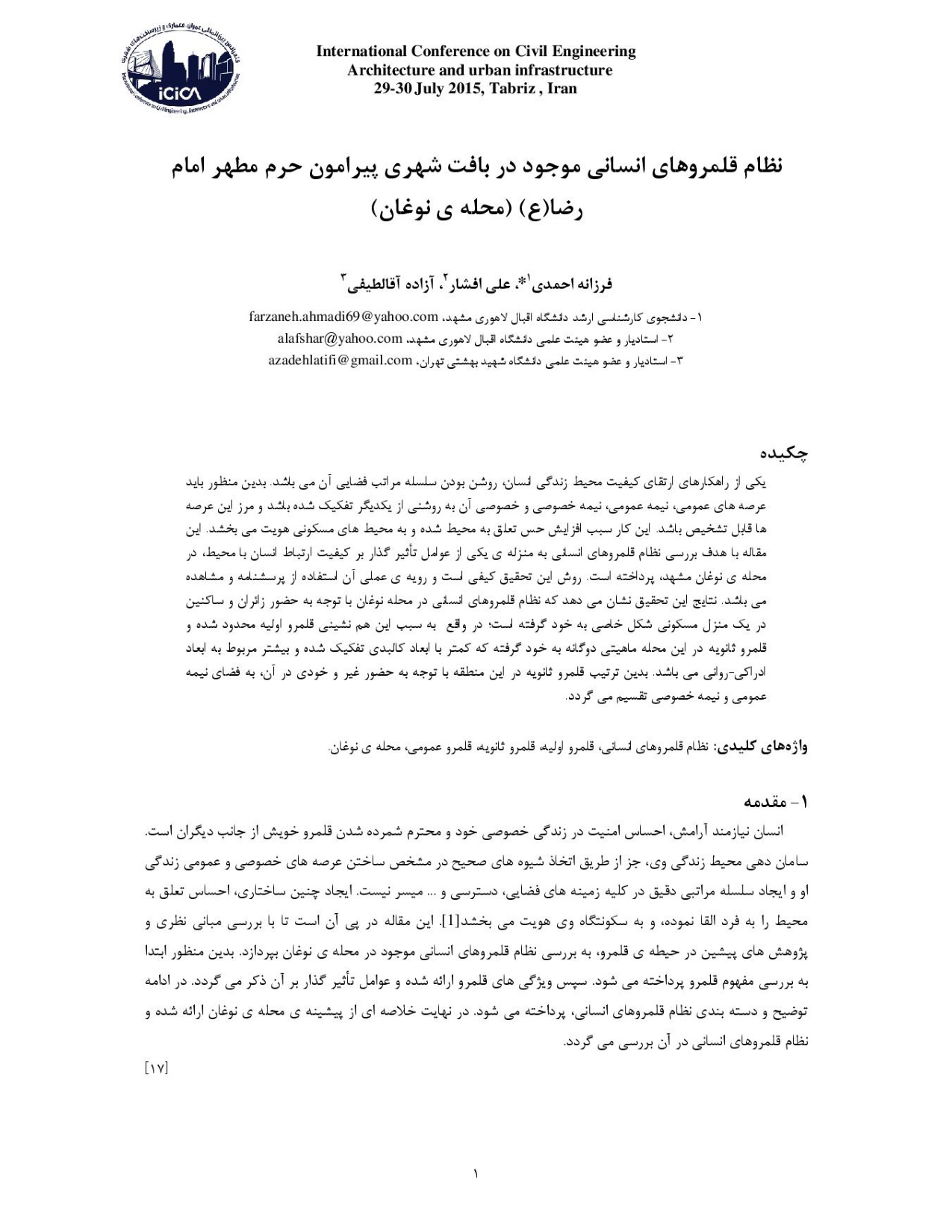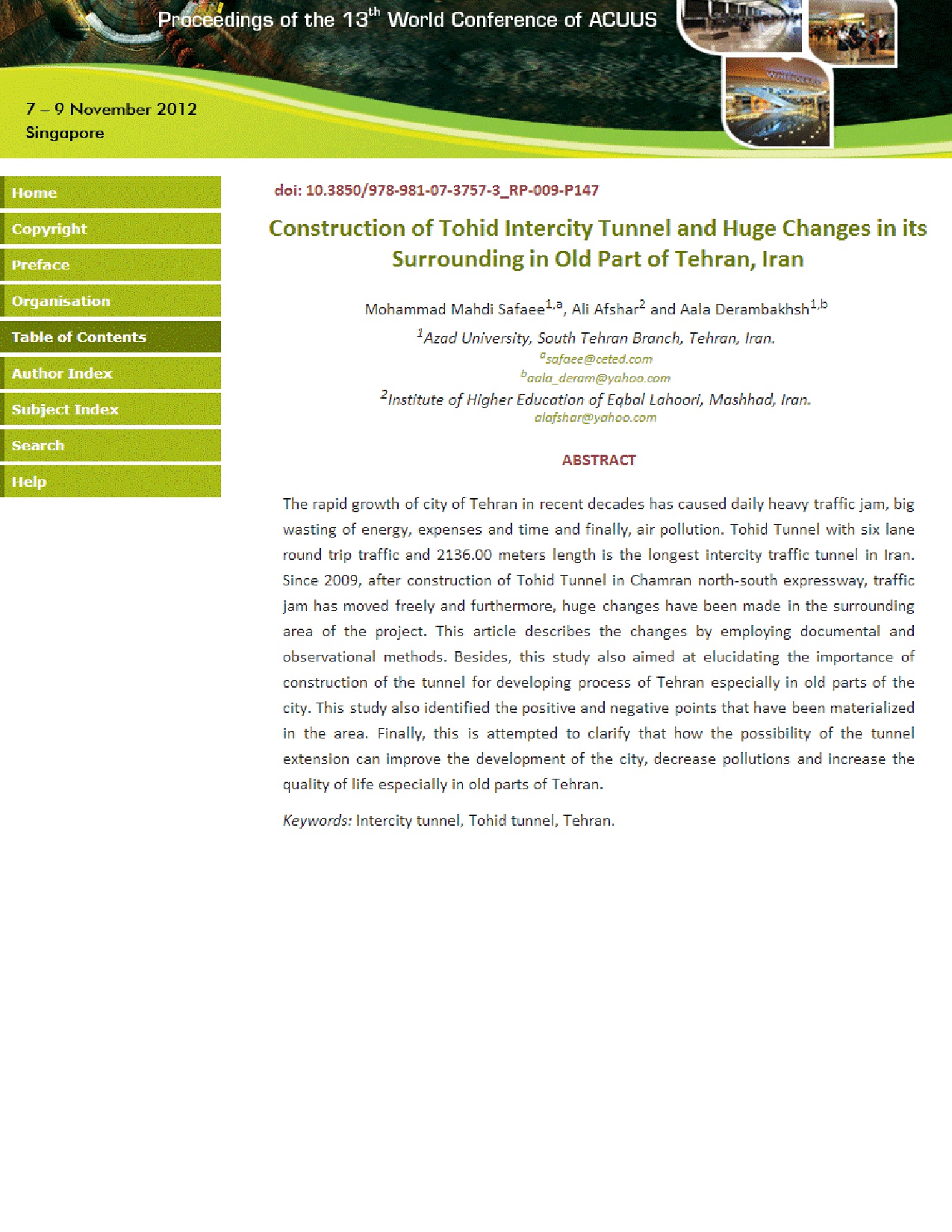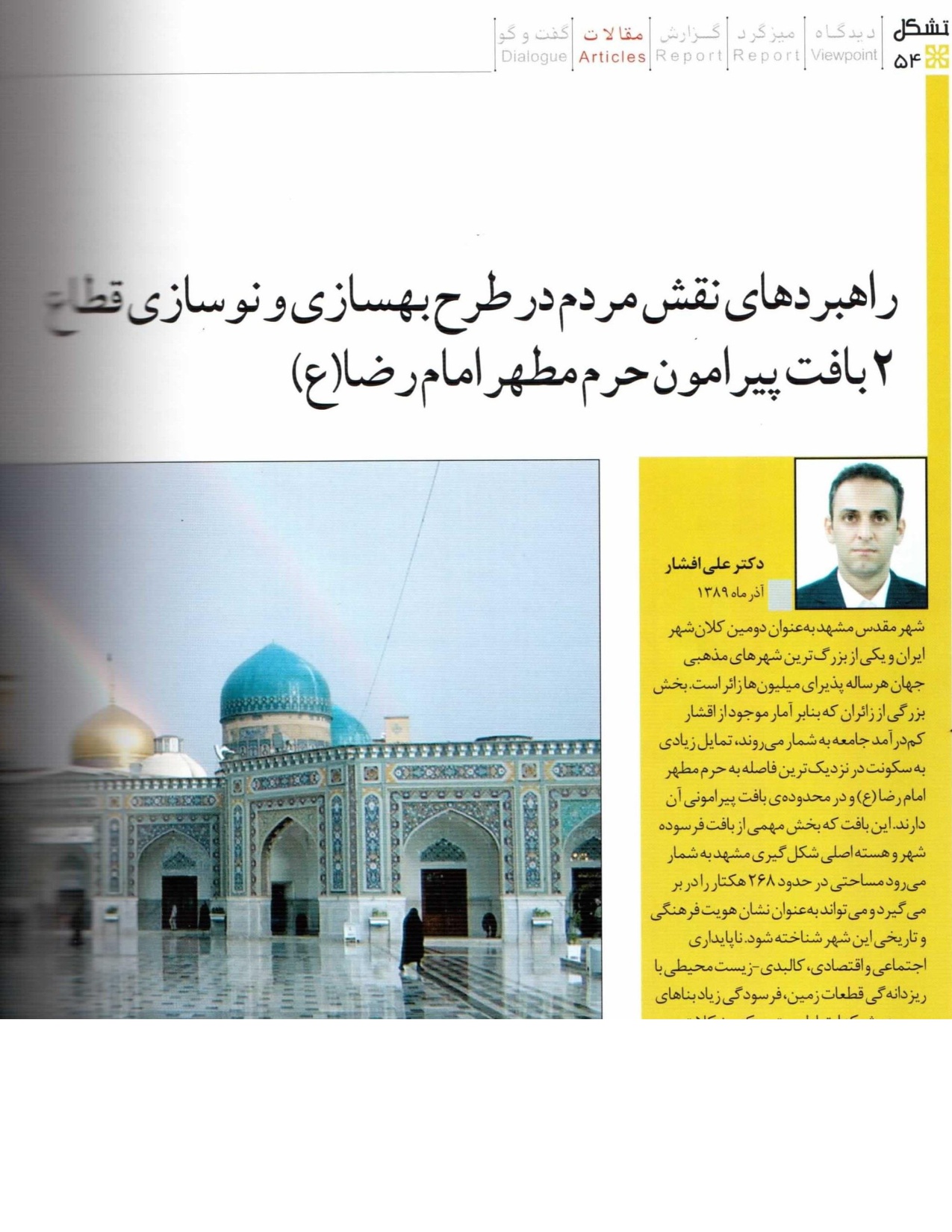 “The Role of People in Renovation and Regeneration of the 2nd Quarter of Old Fabric of Surrounding the Holy Shrine of Imam Reza in Mashhad”, published in Researches and Educational Journal of Tashakkol, Tehran, Iran, 2010 (in Persian)