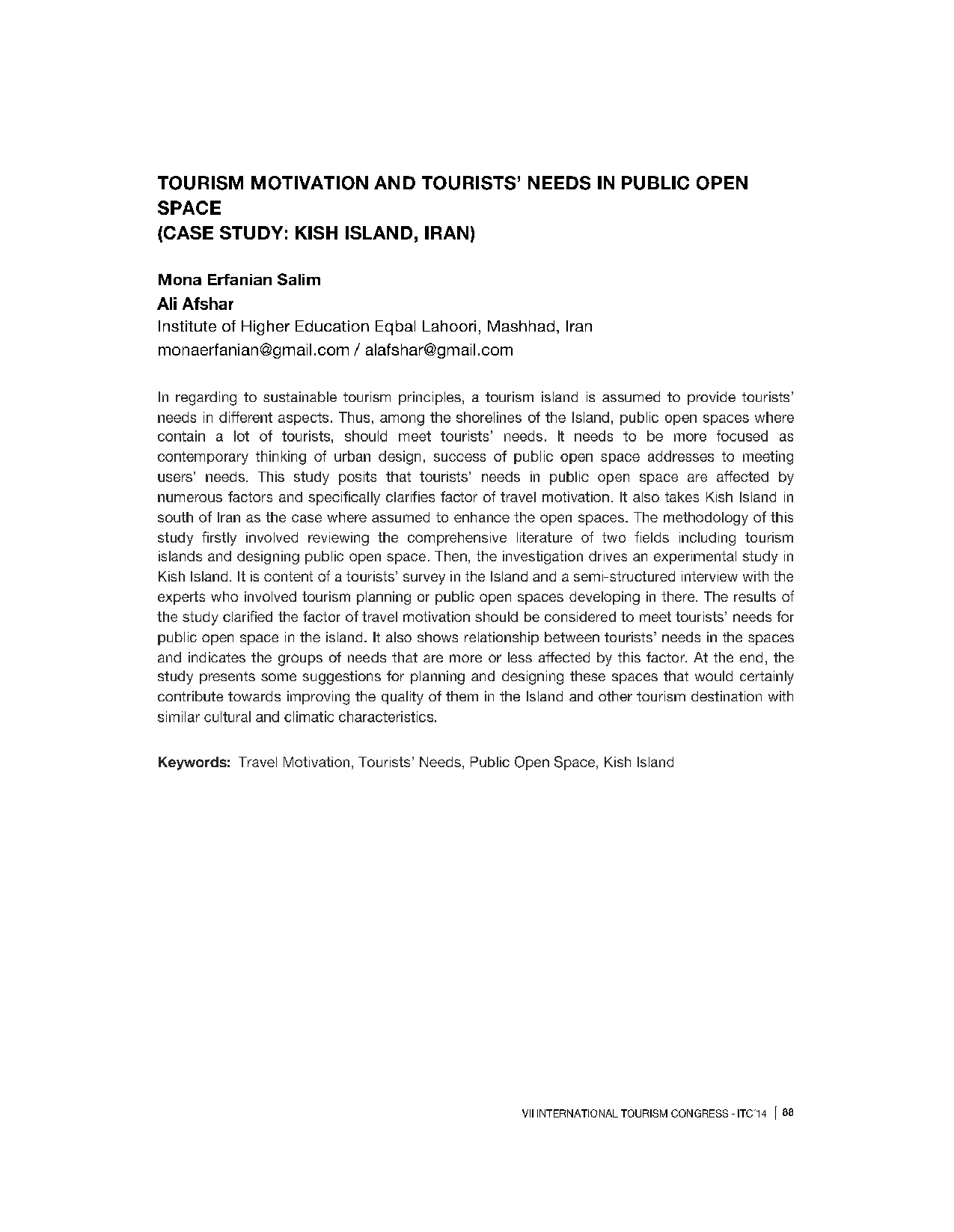 “Tourism Motivation and Tourists’ Needs in Public Open Space (Case Study: Kish Island, Iran)”, accepted for presentation in ITC’14 – International Tourism Congress, Muscat, Sultanate of Oman, 2014. (As an Awarded Paper, Accepted for Publishing in EUROPEAN JOURNAL OF TOURISM, HOSPITALITY AND RECREATION in 2015)