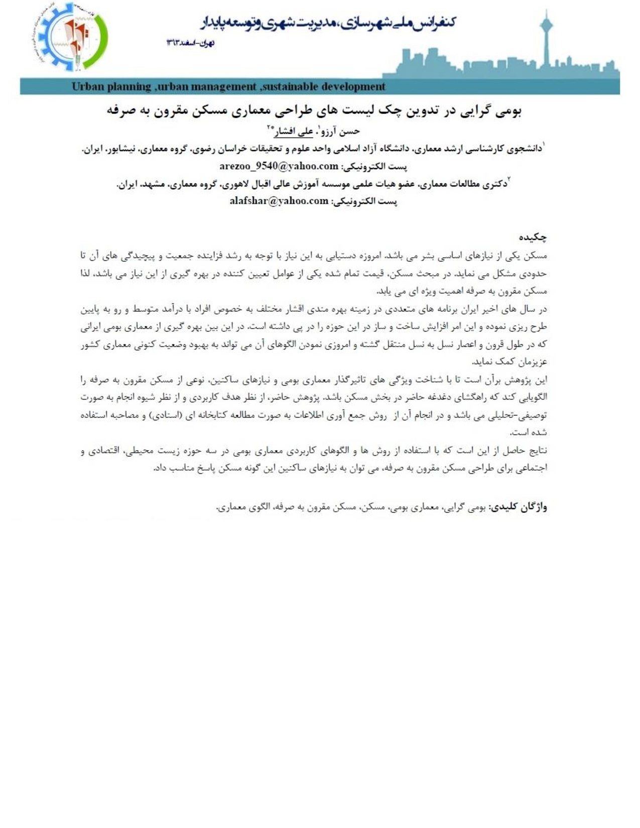“Vernacular Approach in Low-income Houses in Kish Island”, National Conference of Geography, Tourism and Sustainable Development, Tehran, Iran, 2015. (in Persian)