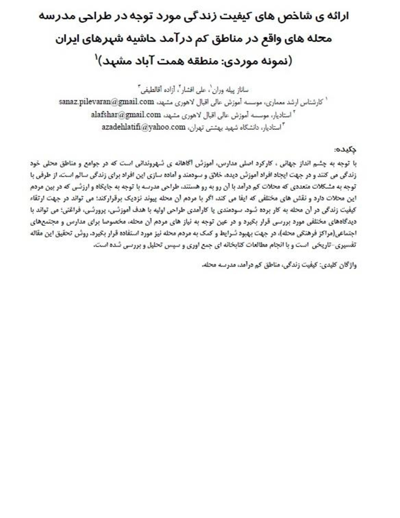 “Important Factors in Architectural Design of a Community School in low-income Districts”, International Conference on Human, Architecture, Civil Engineering and City, Tabriz, Iran, 2015. (in Persian)