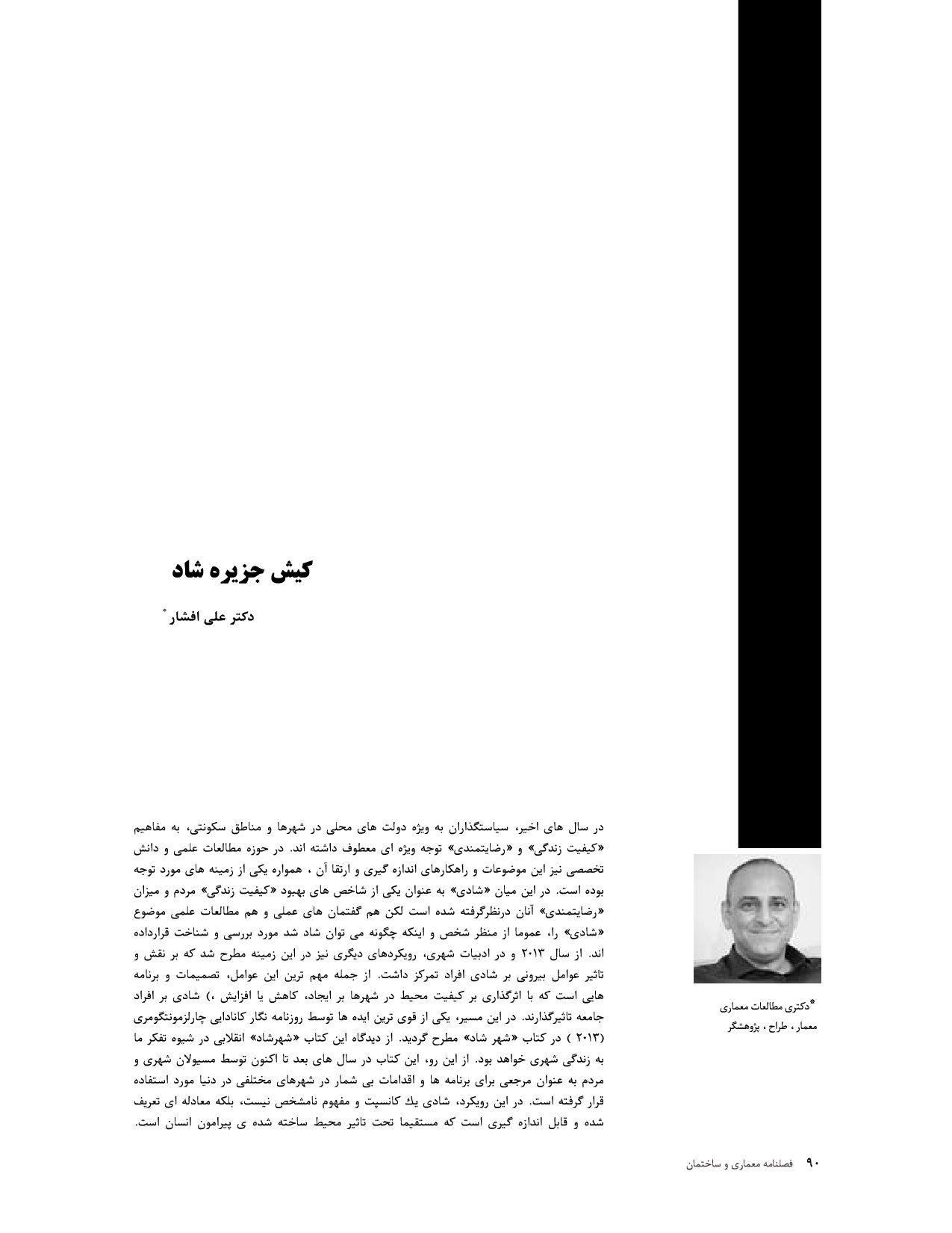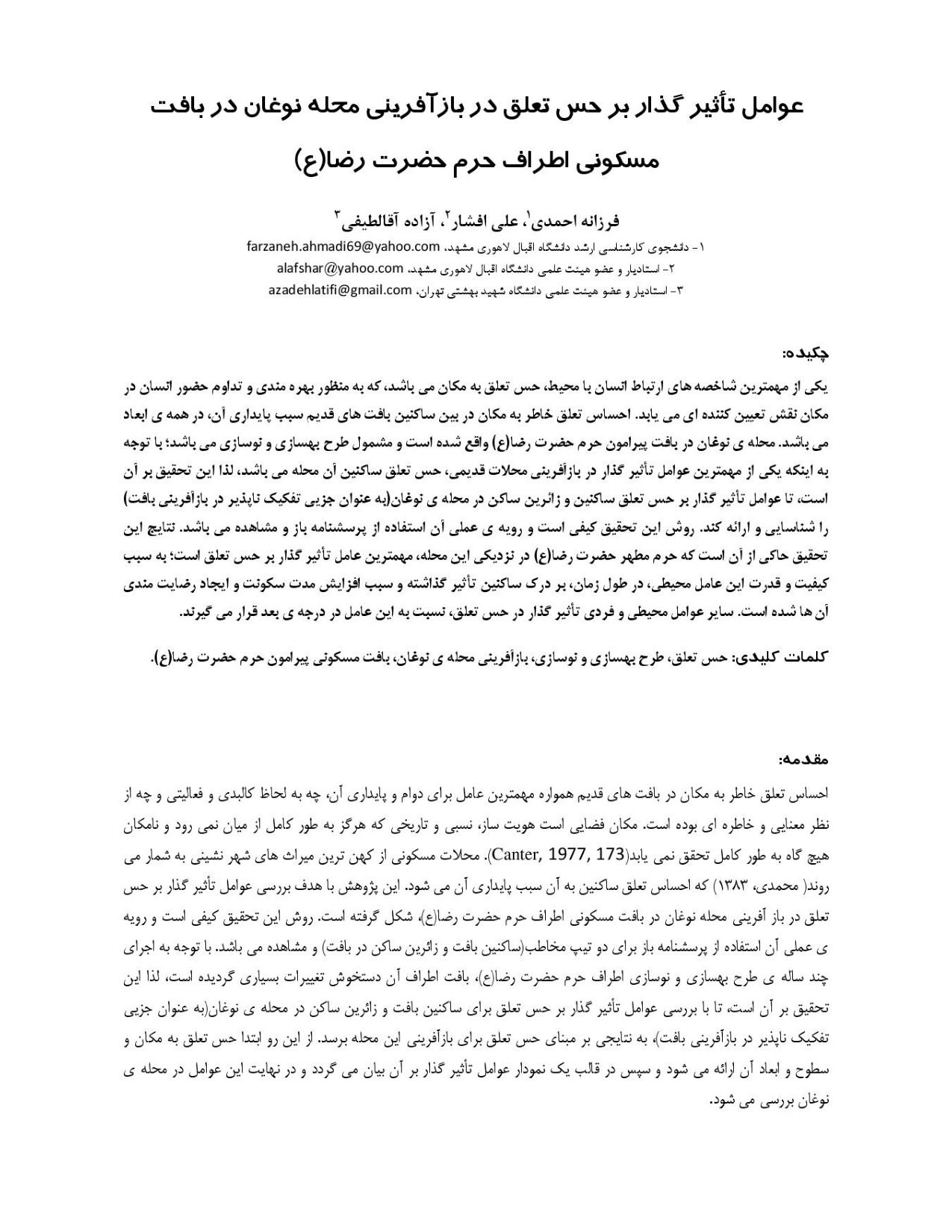 “The Role of Place Attachment in Regeneration Process of Noghan District”, Published in Haft-Shahr: The Journal of Urban Development and Organization, Tehran, Iran, 2017. (in Persian)
