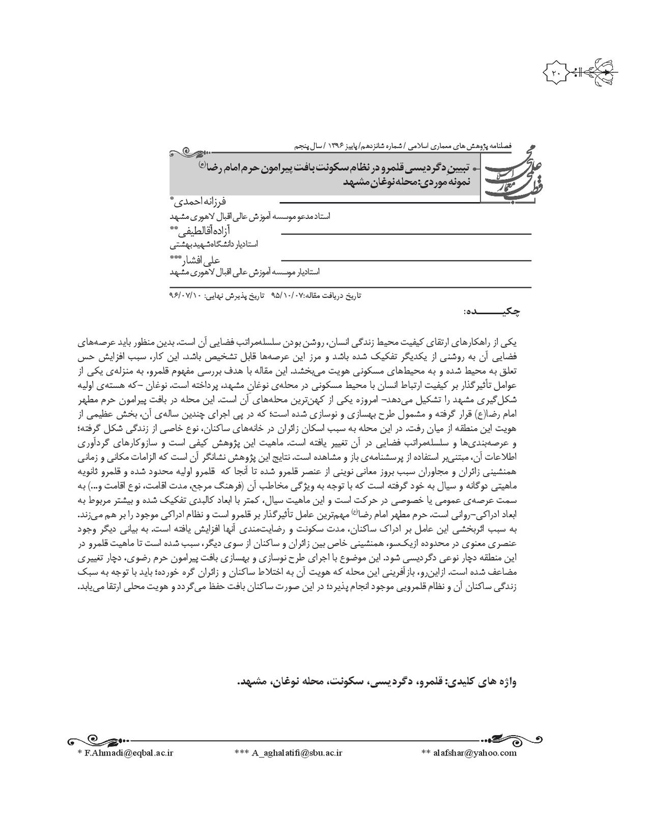 “The explanation of the Transformation of the Realm into the Settlement System in Urban Fabric surrounding the shrine of Imam Reza: Case Study of Mashhad Noghan Neighborhood”, Published in Journal of Researches in Islamic Architecture, Tehran, Iran, 2017